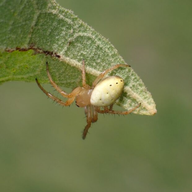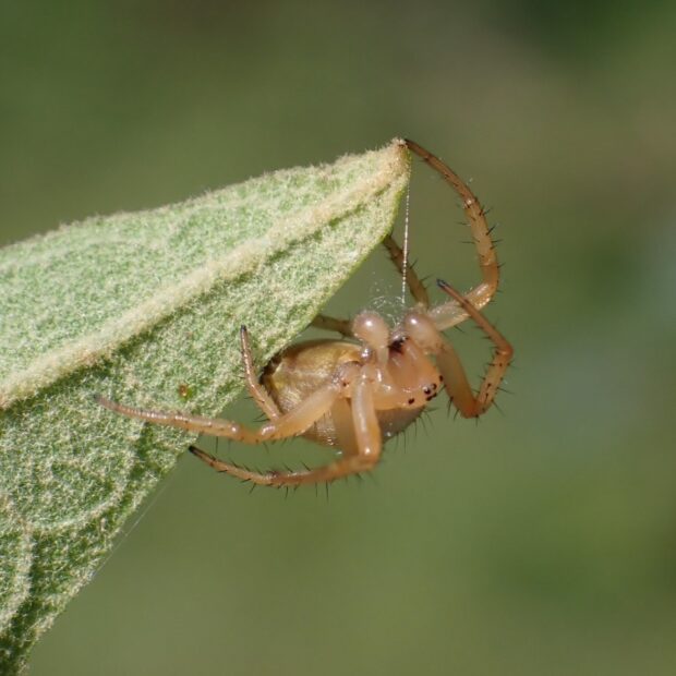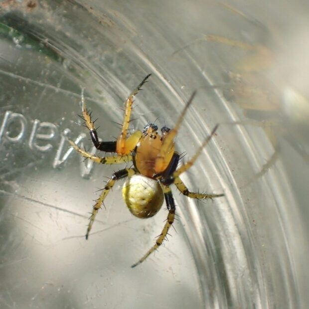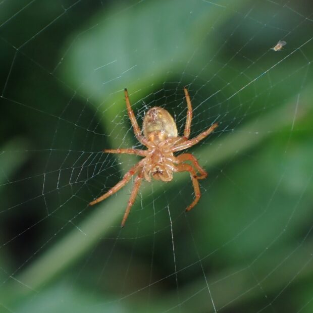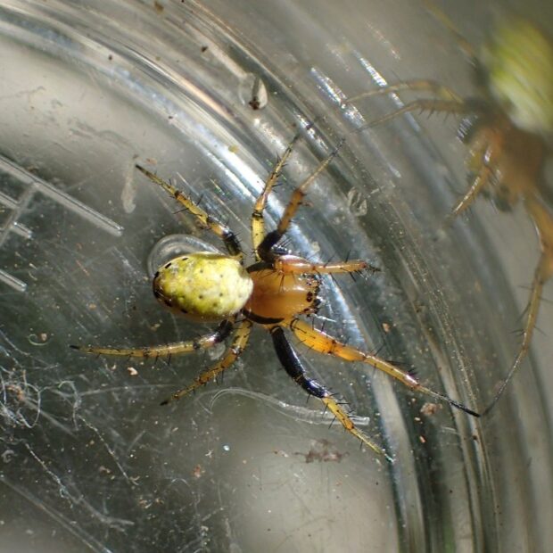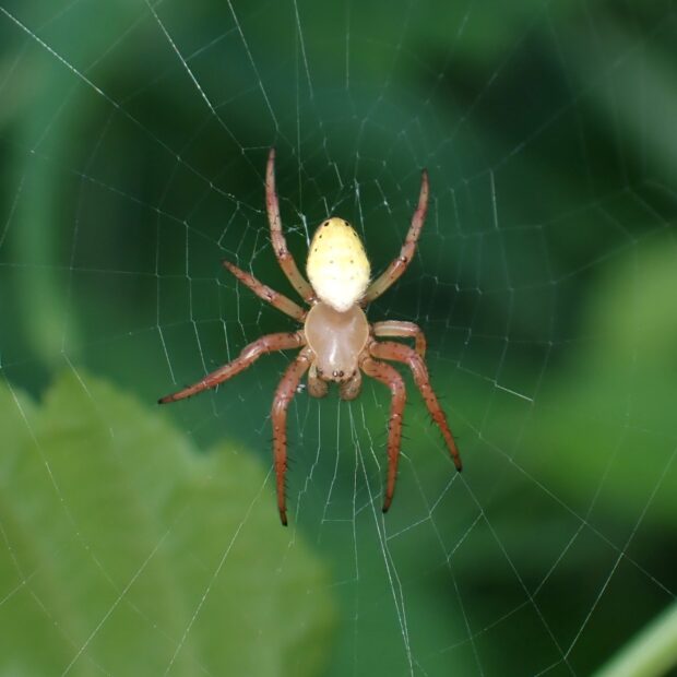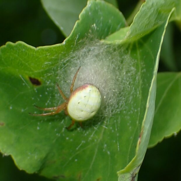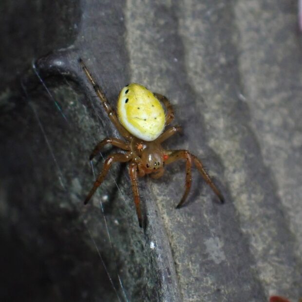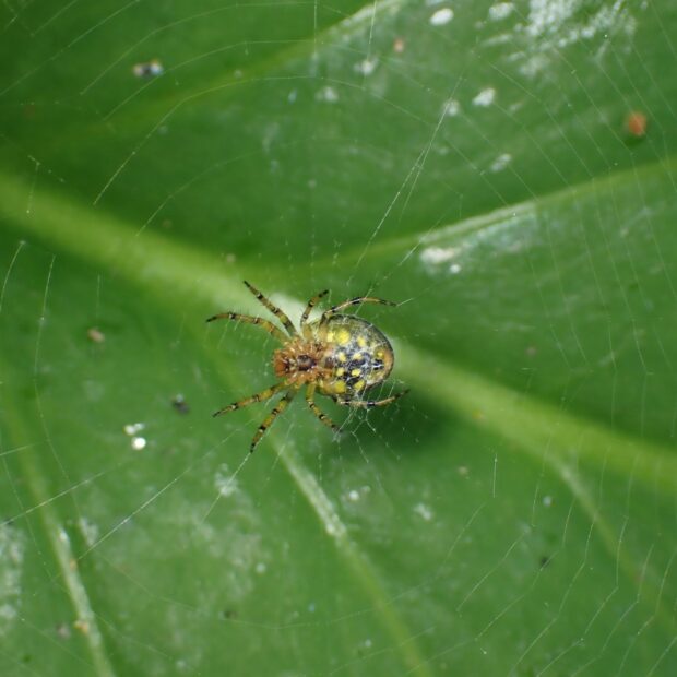 コガネグモ科の仲間。 里山~山地に生息。 黄色い腹部の後方にある3対(6個)の黒点が名前の由来です。 ただ、 黒点は2対や4対のものも見られます。 樹木の葉や枝先に小さな円網を張ります。