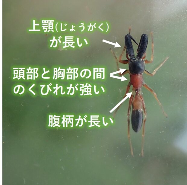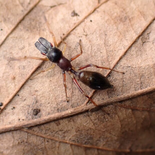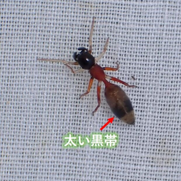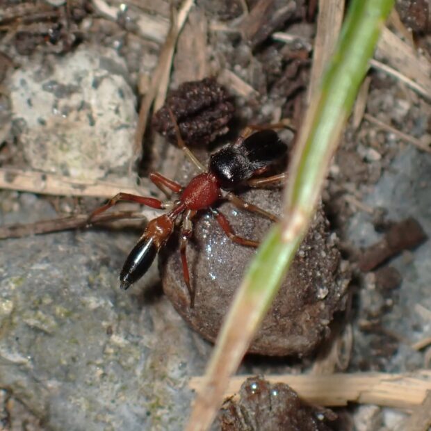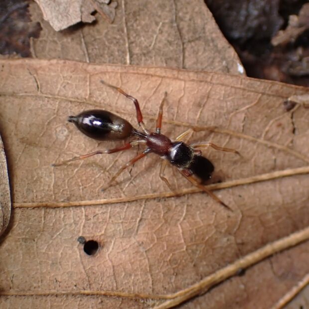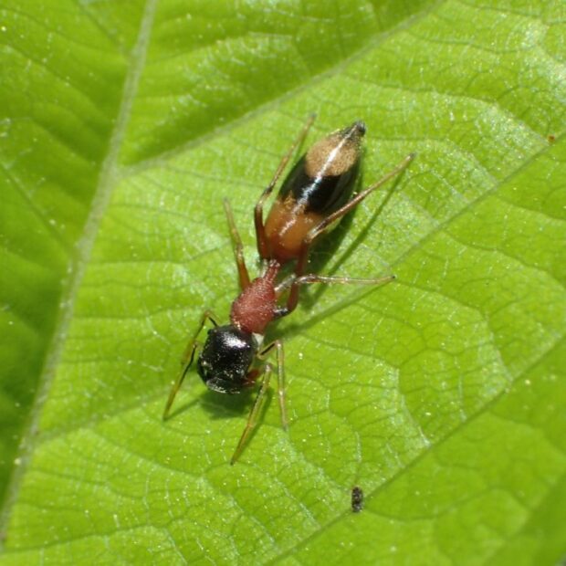 ハエトリグモ科アリグモの仲間。 草はらや樹林地の草木の葉上、 人家の外壁などいろいろな環境に生息しています。 赤みのない黒っぽいものも見られます。