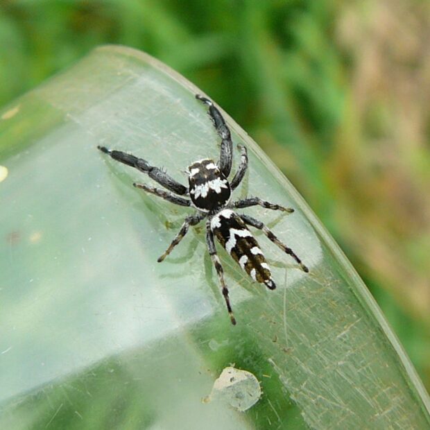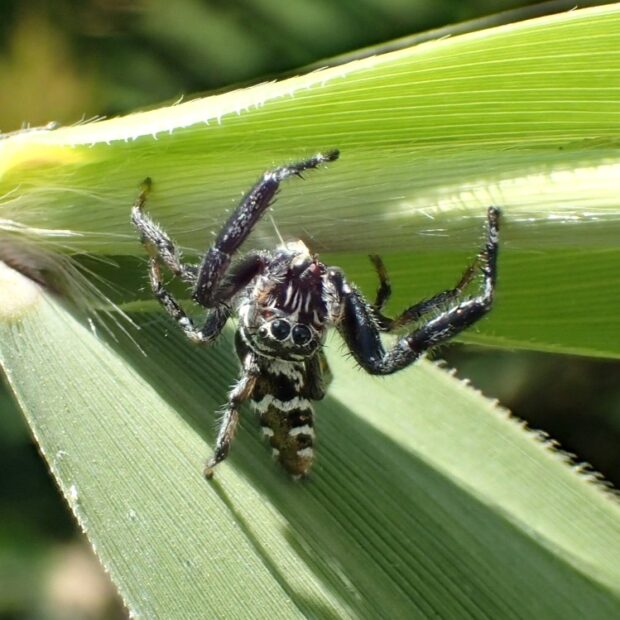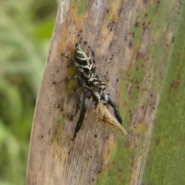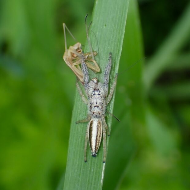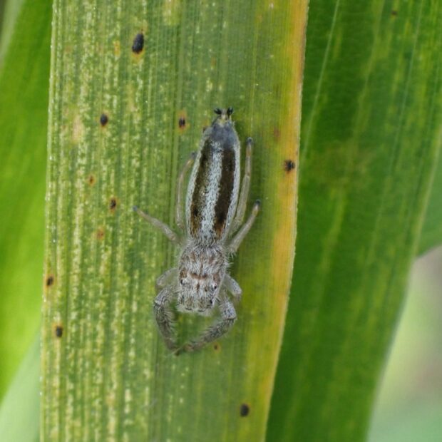 ハエトリグモ科の仲間。 ほっそりした体型で、 オスとメスで色や模様が全く違います。 水辺や草はらのススキやヨシなどイネ科植物の葉の上で生活しています。