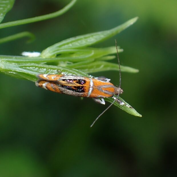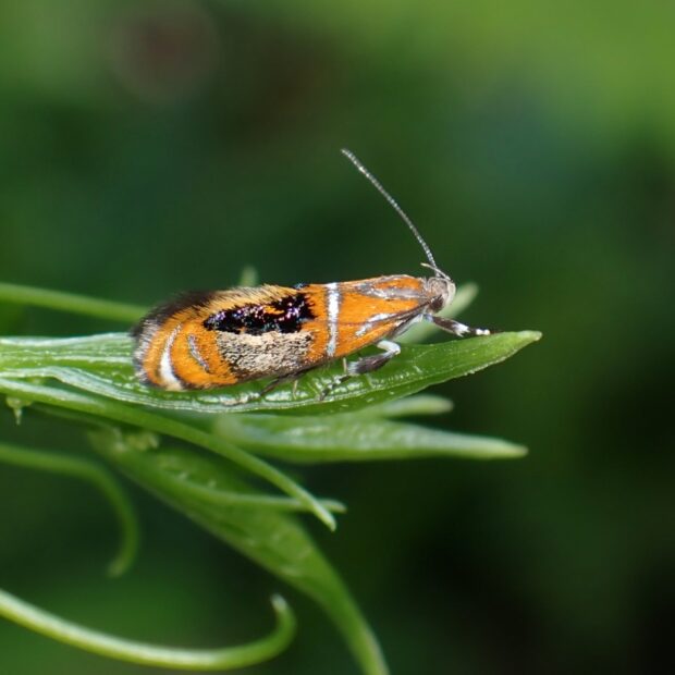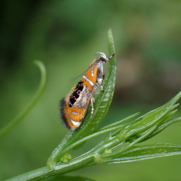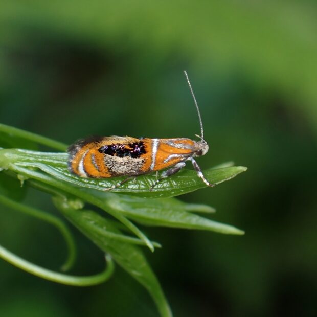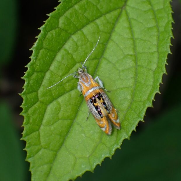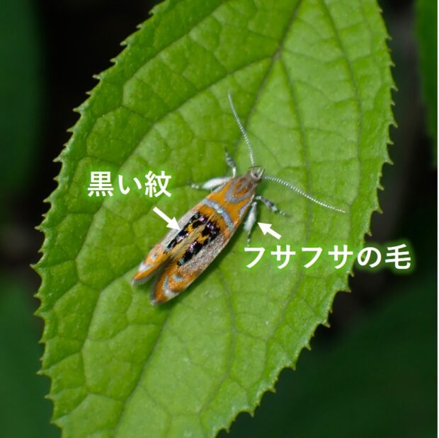マルハキバガ科の仲間。 オレンジ色のはねに黒紋と銀色のスジがあり、 小さいながらとても美しいガ。
