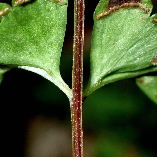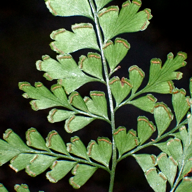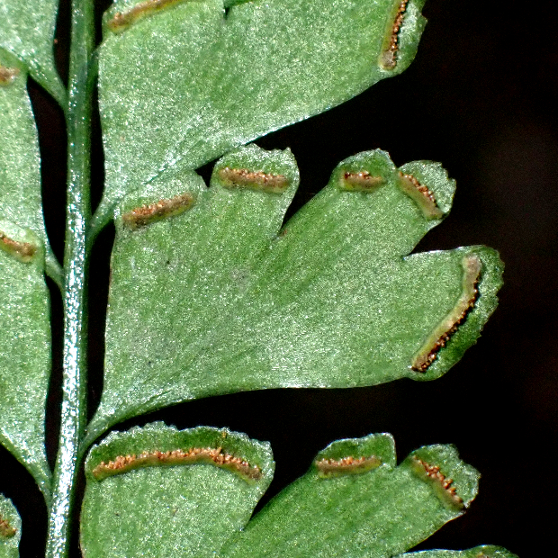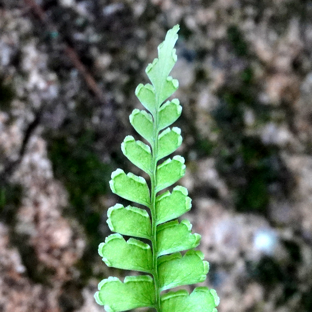 日本では琉球に多く、 北東では静岡県にまで分布する小さめのシダ。 葉は下ほど羽片が長くて、 三角形状のことが多いです。 小羽片は扇形で先がいくつか切れ込み、 この中に胞子のう群がフチに沿ってつきます。