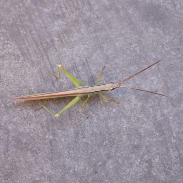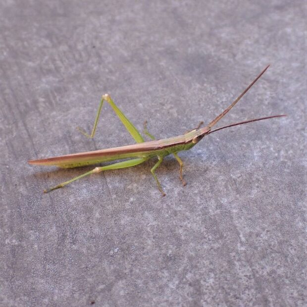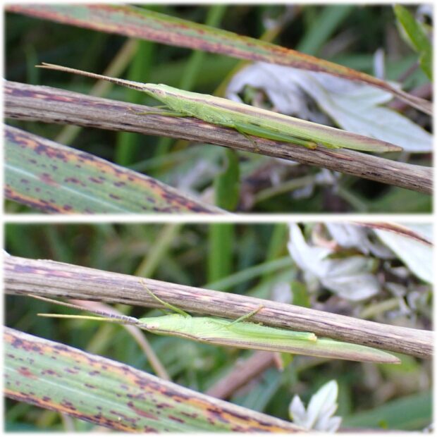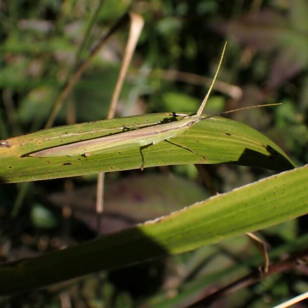 バッタの仲間。 日当たりのよいイネ科植物が生える草地で見られます。 体は緑色のものが多いですが、 褐色のものもいます。 後あしは短く、 止まっているとき体にそわせています。 飛翔力は弱く、 飛ぶときにチキチキという音は立てません。