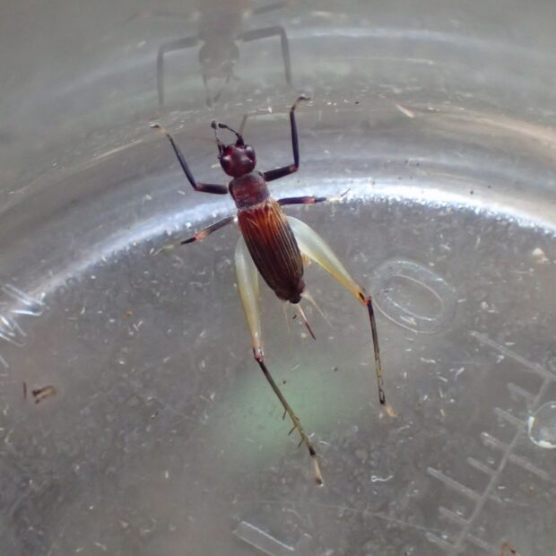 ヒバリモドキ科の仲間。 うす暗い林や林縁の下草で見られます。 赤みのある胸部が特徴。 オスは「ギ・ギ・ギ」と不規則に鳴きます。