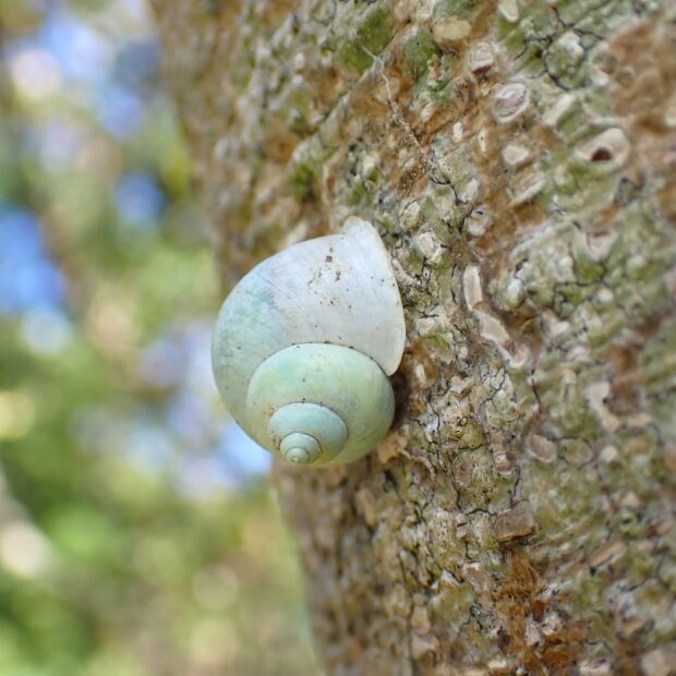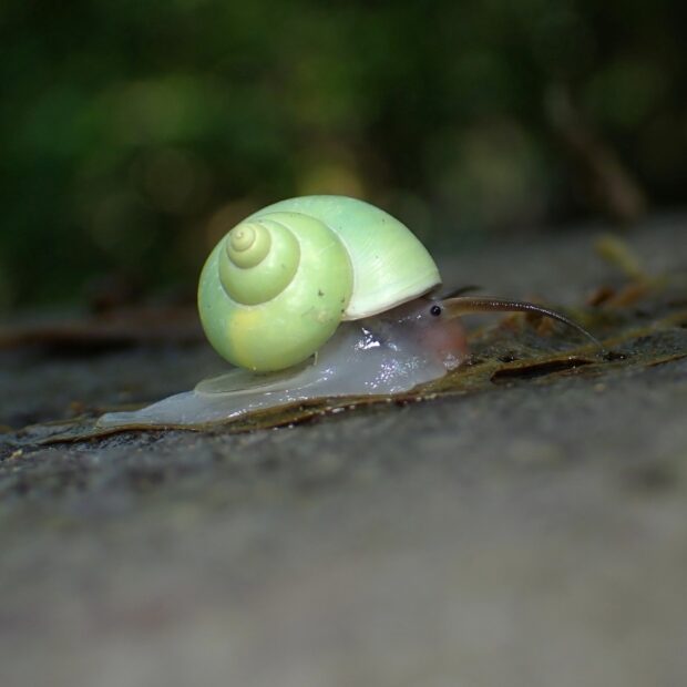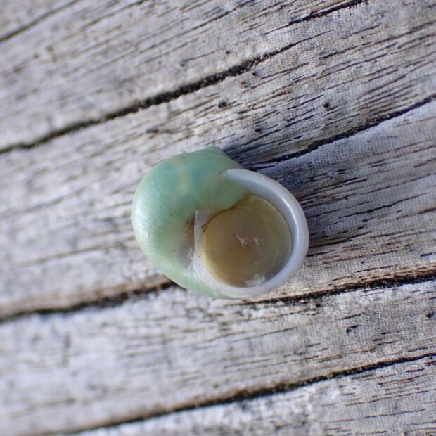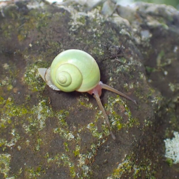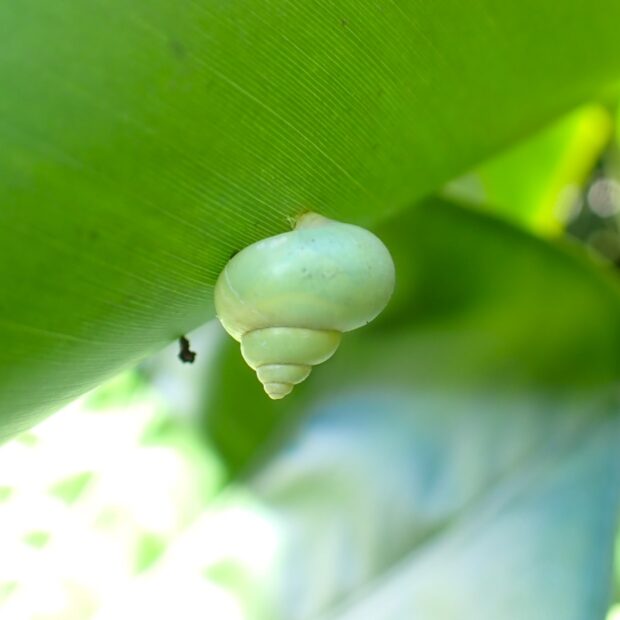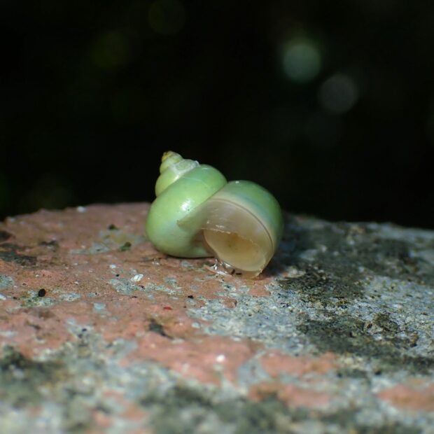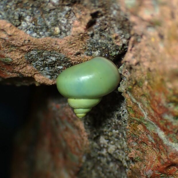 ヤマタニシ科の仲間。 透き通るような緑色のカタツムリ。 木の幹や葉の裏、 草で見られます。 緑色は殻の色ではなく、 緑色の軟体が殻を通して見えています。 殻は白色です。