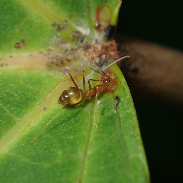 触角とあしがとても長く、 スマートで透明感がある熱帯のアリ。 沖縄では、 街中、 草地などで普通に見ることができます。 世界中に分布を広げ、 侵略的外来種ワースト100に入っています。