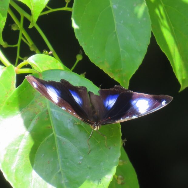 「迷チョウ」と呼ばれる美しいチョウ。 オスとメスではねの模様が違います。 オスは青紫に輝く紋が4個あり、 光が当たる角度で色が変わります。 メスは地域によって変異が大きく、 いくつかの型が知られています。