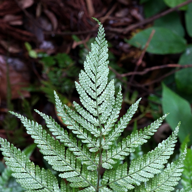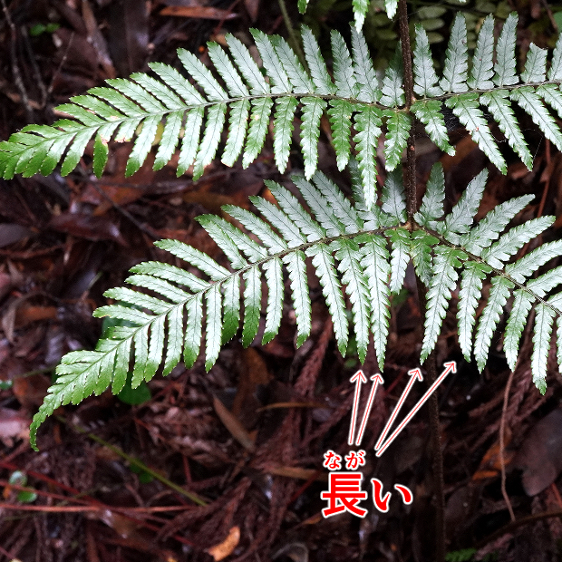 近年の研究でベニシダは、 大昔にハチジョウベニシダとマルバベニシダが交雑して生まれたと考えられています。 マルバベニシダは、 ベニシダよりも葉が厚くパリパリとした質感で、 小羽片に丸みがあるのが特徴です。 つまりハチジョウベニシダは、 ベニシダからこの特徴を抜いたものだと意識しておくと見当をつけやすいです。 ただし、 この両種は外見がほぼ同じのことがあり、 これだけですべての個体を見分けるのは困難だともいわれています。