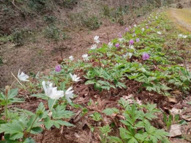 カタクリの花の時期に一緒に咲き、 キクザキイチゲは群落でみることが多い春植物です。
