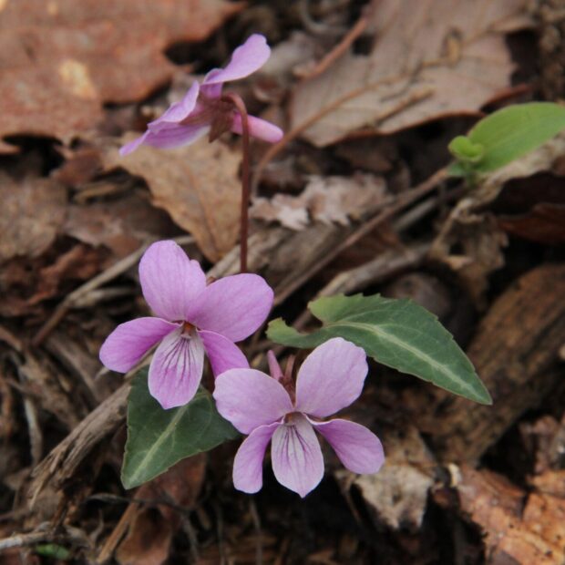 早春の林の中、 尾根筋にもみられる小型の赤紫の色が濃いスミレです。