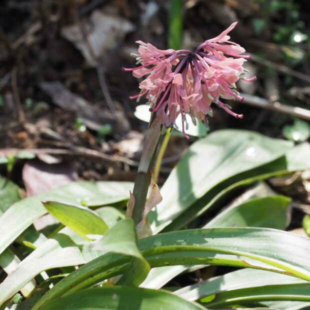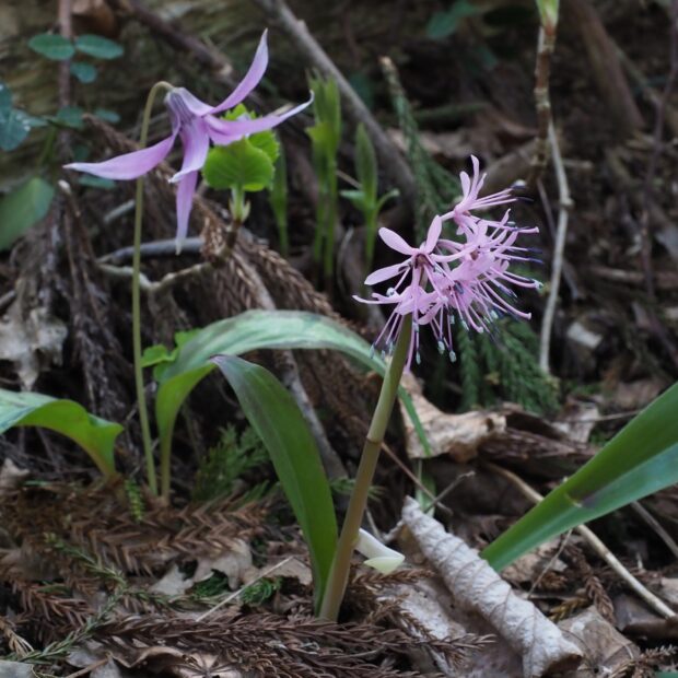 山沿いの谷筋や林野の湿った場所で見られます。 花の色は濃いピンク、 薄紅色、 白などで、 雪どけとともに見ることができる花です。 花が成熟すると茎が高くなります。