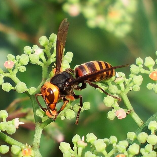 攻撃性が高く、 刺されると激痛が走り、 命にかかわることがあります。 8~10月はスズメバチの被害が多くなる季節ですので、 巣には近づかないよう特に注意してください。 黒いものに攻撃してくるので、 黒い服装は避けましょう。 ハチがカチカチといわせながら、 近づいてくると、 慌てないでその場からすぐに離れましょう。 ハチを手で払わないようにしてください。 万が一、 刺された場合は、 傷口を水で洗い流してください。 息苦しさなど様子がおかしい場合は、 一刻も早く病院で診察を受けてください。