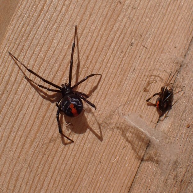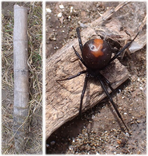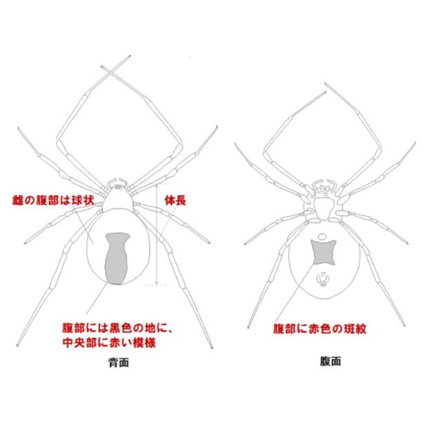 もともと日本にいなかったクモで、 外国からやってきた外来種。 メスは、 大型で派手な色合い。 強い毒を持ちます。 オスは小型で複雑な模様でメスとは全く違う色合いです。