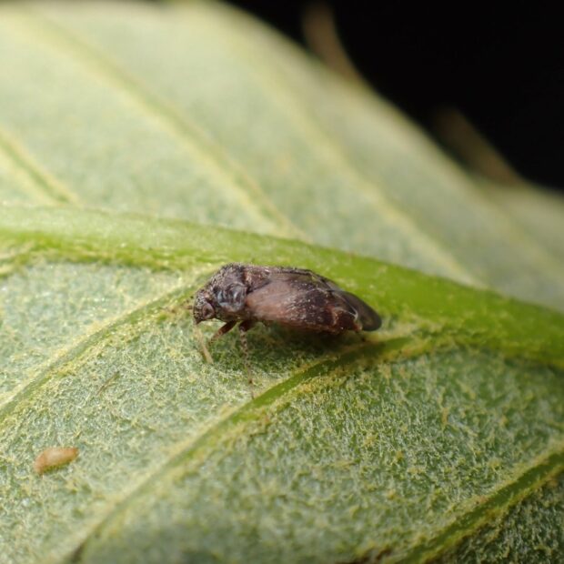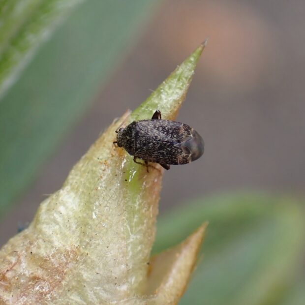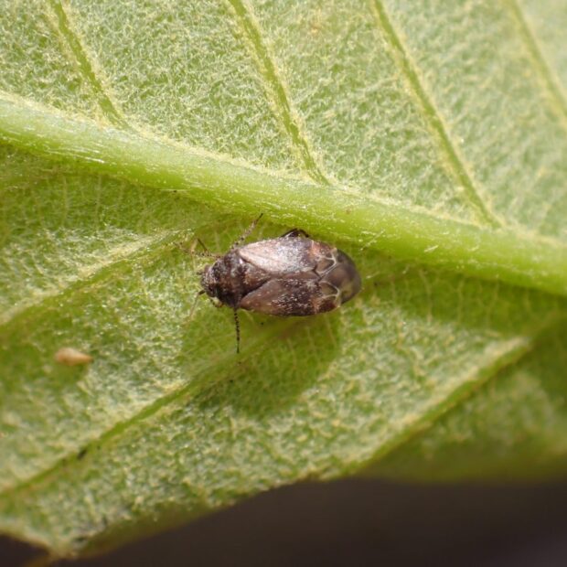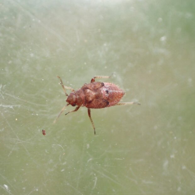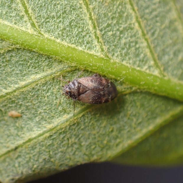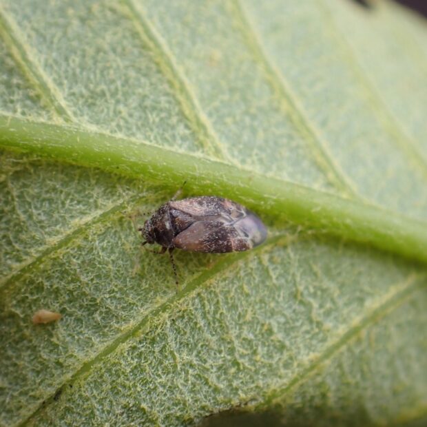 カスミカメ科トビカスミカメの仲間。 黒褐色で、 毛深いカスミカメ。 春、 クヌギやクリの葉裏で見られます。