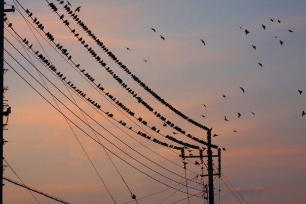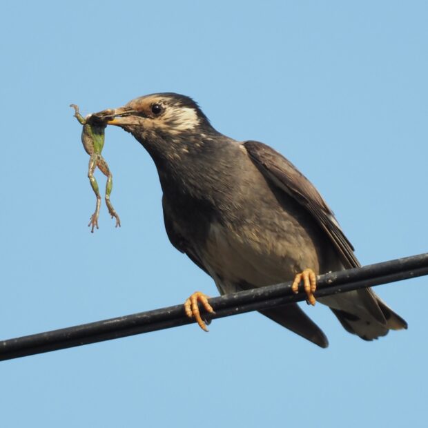 芝生や畑で草の間の虫を捕まえるのがよく見られます。 全身が黒っぽくて、 頭に白色が混じっています。 ヒナを育てている時以外は集団でねぐらをつくります。 夕方ねぐらに帰る時、 大合唱しているのが聴こえるかもしれません。