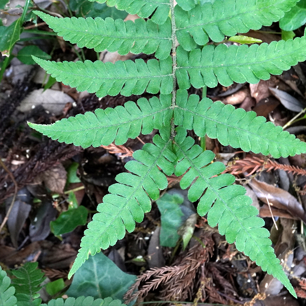 胞子葉は葉柄が長く、 羽片間のすき間がより広め。