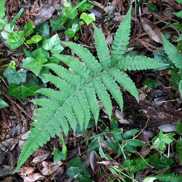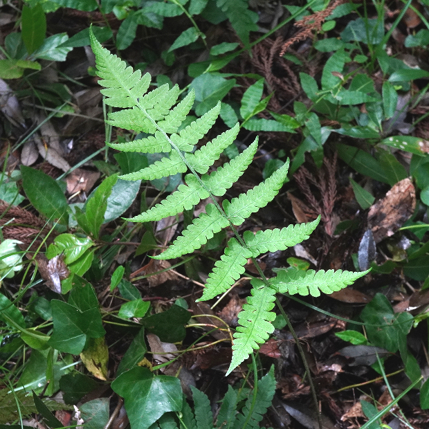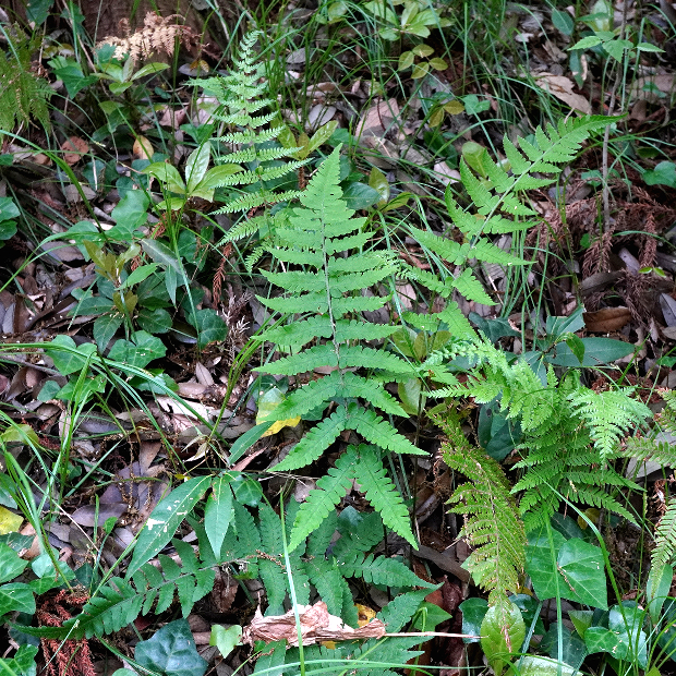 右や奥の切れ込み深い葉は別種のハシゴシダ。