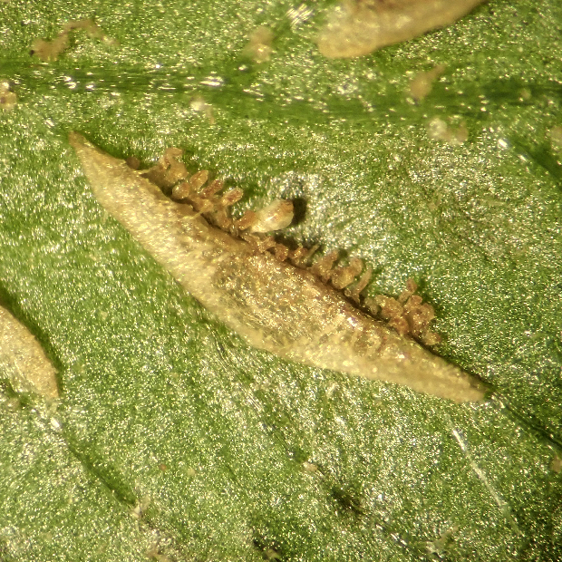 胞子のう群は楕円形で、 やや脈寄りにつく。