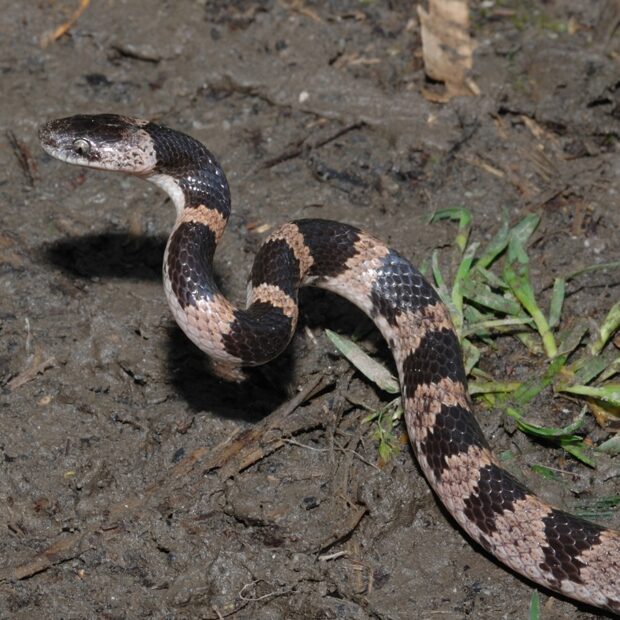 成蛇も幼蛇も尾から後頭部まで、 灰褐色に黒の斑模様が入ります。