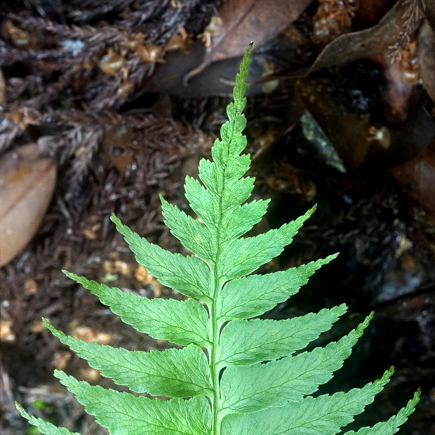 暖かい地域に生えるノコギリシダに近縁のシダ。 本種の方がずっと希少で、 冬に地上部を枯らす夏緑性なので、 質はより薄くペラペラしています。 また、 羽片の数はより少なく、 葉裏につく胞子のう群はより長く、 根茎が短めでまとまって葉を出します。 両者で雑種をよく作ります。 名前は愛媛県の旧国名である伊予と、 葉を広げる姿がクジャクの羽に似ていることが由来です。