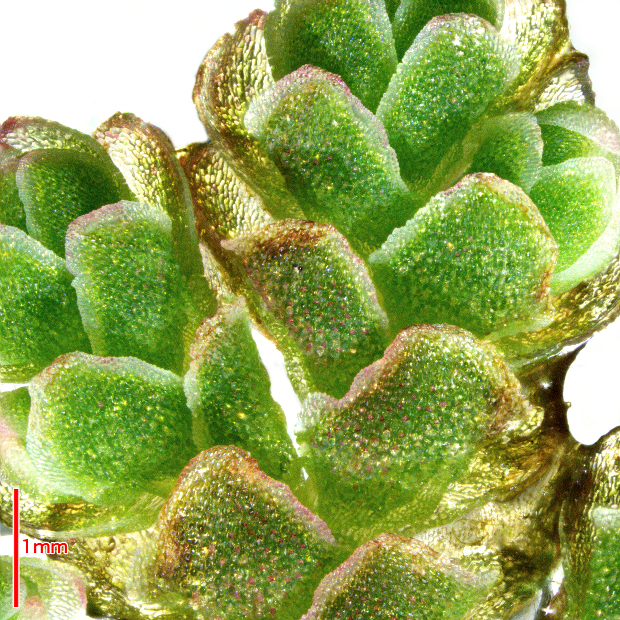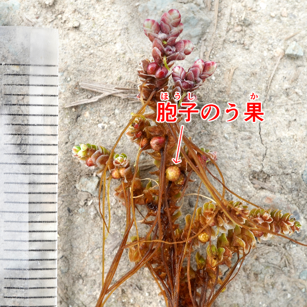 視覚的にもわかりやすい特徴。 葉の長さは但馬型で1~2mmになり、 1mmを下回ることが多い外来アゾラよりも明らかに大きくなります。 さらに、 但馬型は葉が正方形になる傾向があります。 植物体全体も但馬型のほうが大きめですが、 湧水地では外来アゾラも大きくなることがあります。