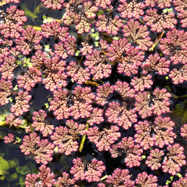 自然豊かな水辺に浮かぶ水生シダ。 植物体は不規則なアメーバ状の形をしていて、 ウロコみたいな葉に覆われます。 冬が近づくと、 鮮やかなピンク色に紅葉してきれいです。 初夏頃、 まれに茎の下に胞子のう果をつけます。 近年猛威を振るっている外来種のアカウキクサ属(外来アゾラ)とは、 葉がより大きくて表面の突起が小さめで、 水中に伸びる根につく根毛が早く抜けてしまうことなどで異なりますが、 区別が難しいです。 もう1つの在来種であるアカウキクサは、 植物体が三角形なので簡単に区別できます。
