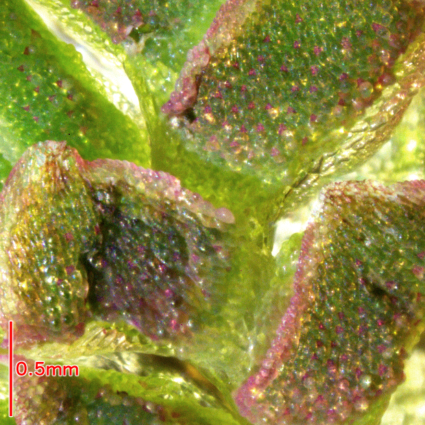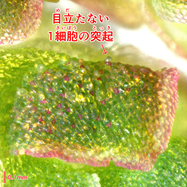 調べるのに顕微鏡が必要な特徴。 但馬型の突起は1細胞で小さめ。 一方、 外来アゾラは表面のツブツブが目立つことが多く、 特に2細胞からなる突起があれば外来アゾラと判断できます。 ただし、 外来アゾラでも突起が目立たないことがあり、 これだけで但馬型とすることはできません。