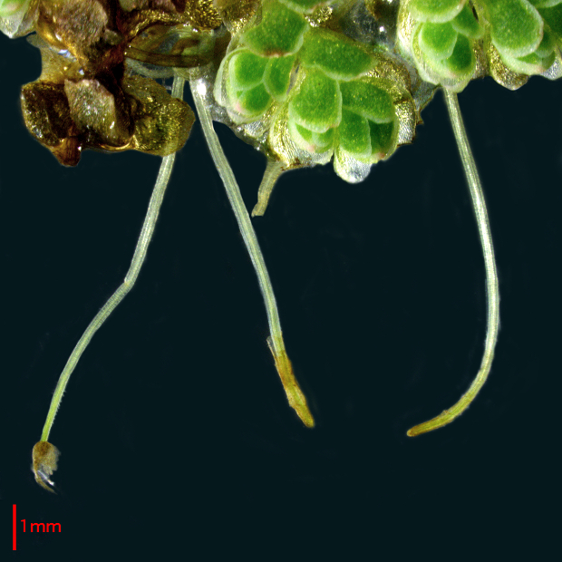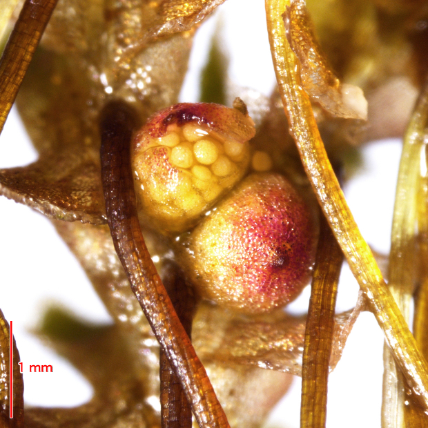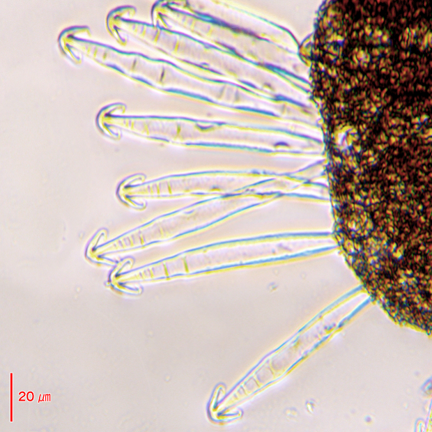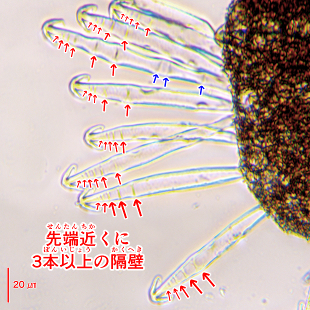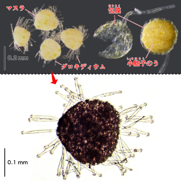 論文でも示されている、 DNA以外では最も信頼できる特徴。 胞子のう果にできる球状体(マスラ)につく錨状の突起をグロキディウムといいます。 このグロキディウム内部にある仕切り(隔壁)の本数と位置が種類によって違い、 但馬型は先端近くに3本以上できます。 対してニシノオオアカウキクサでは隔壁がないか、 まれに先端近くに1~2本しか見られません。 アメリカオオアカウキクサは全体に多数の隔壁をもつ傾向があります。 この識別法の最大の問題点は、 オオアカウキクサ類が胞子のう果をあまり作らず、 観察が難しいところにあります。