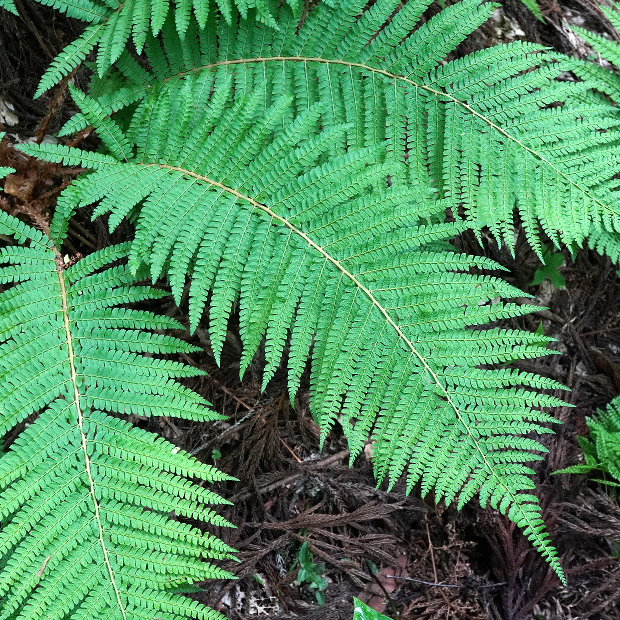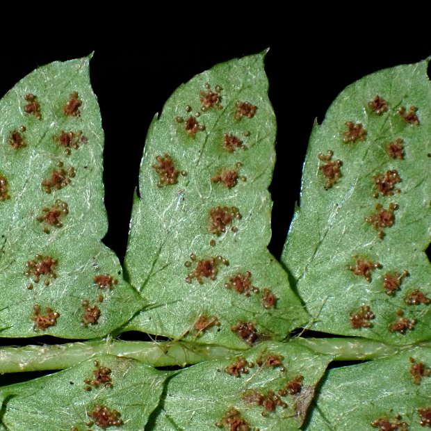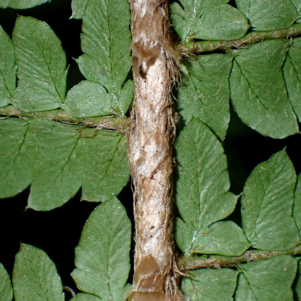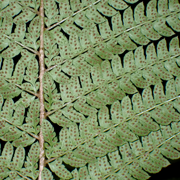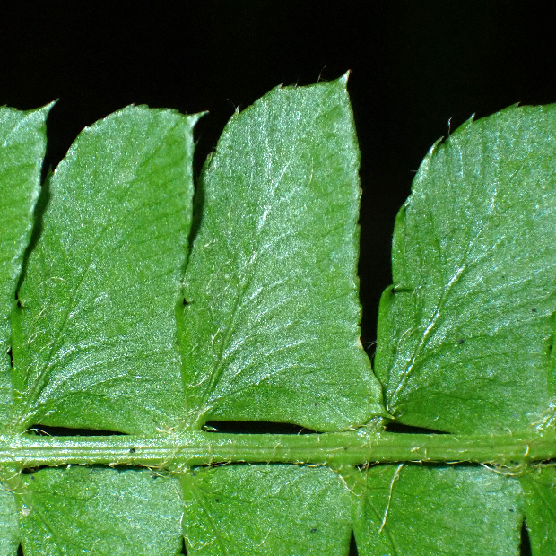 日本海側の林内に多いイノデ類のシダ。 ツヤのない黄緑色の大きな葉を、 放射状に多数広げます。 一番の特徴は、 葉軸に下向きに圧着してつく鱗片で、 名前の由来にもなっています。