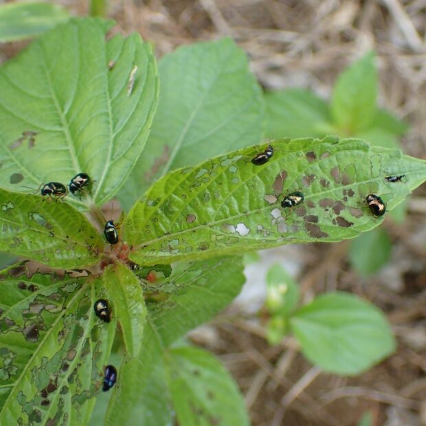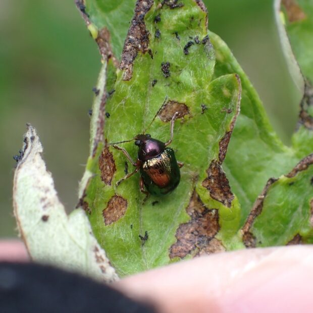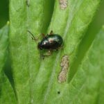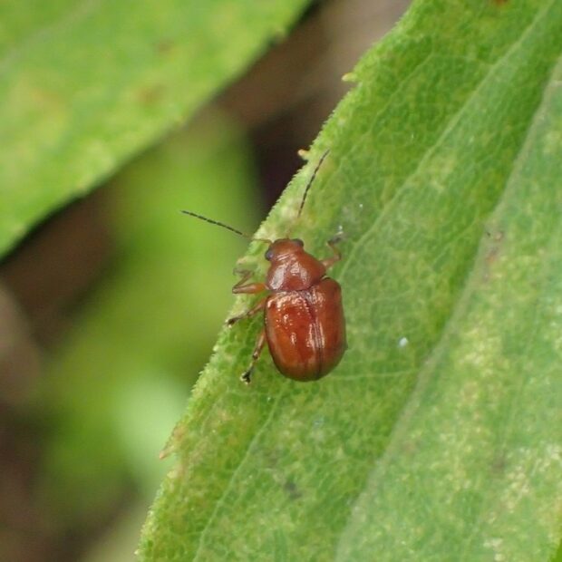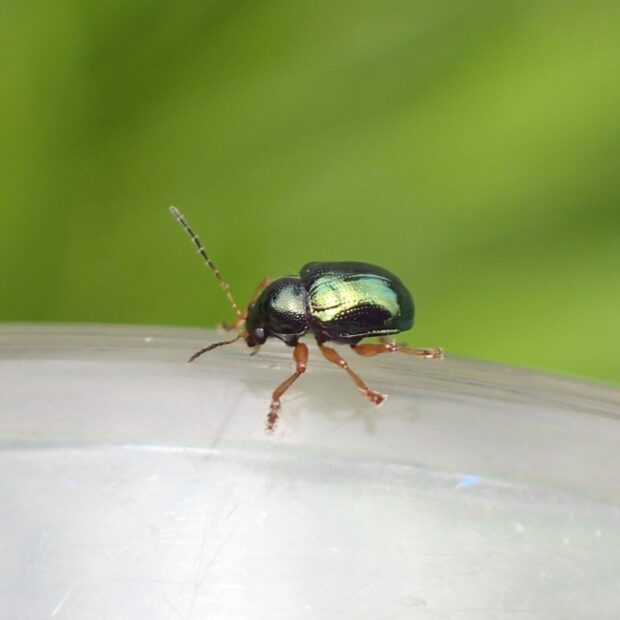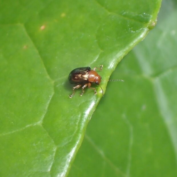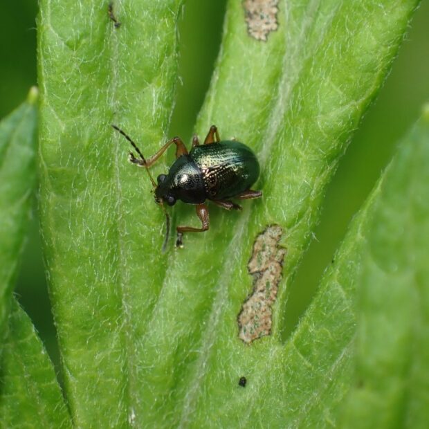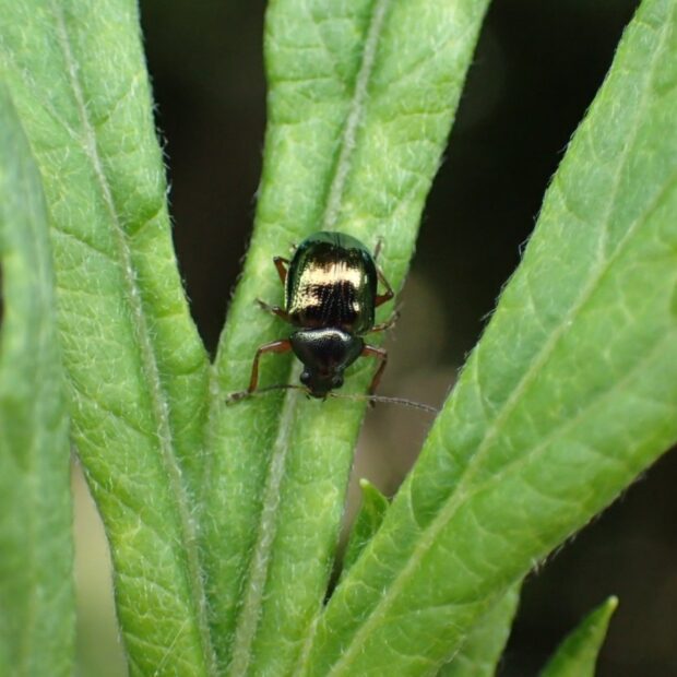 サルハムシの仲間。 ヨモギなど様々な植物の葉を食べ、 普通に見られます。 胸や上翅(じょうし)は光沢があり、 銅緑色、 藍色、 赤褐色など変異に富みます。