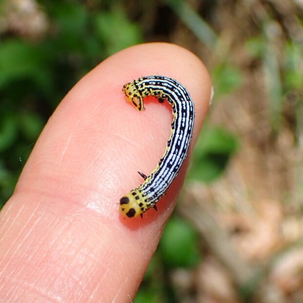 春一番に現れるエダシャクの仲間。 年1化。 幼虫は頭部に2個の黒い紋があり、 サングラスをかけているよう。