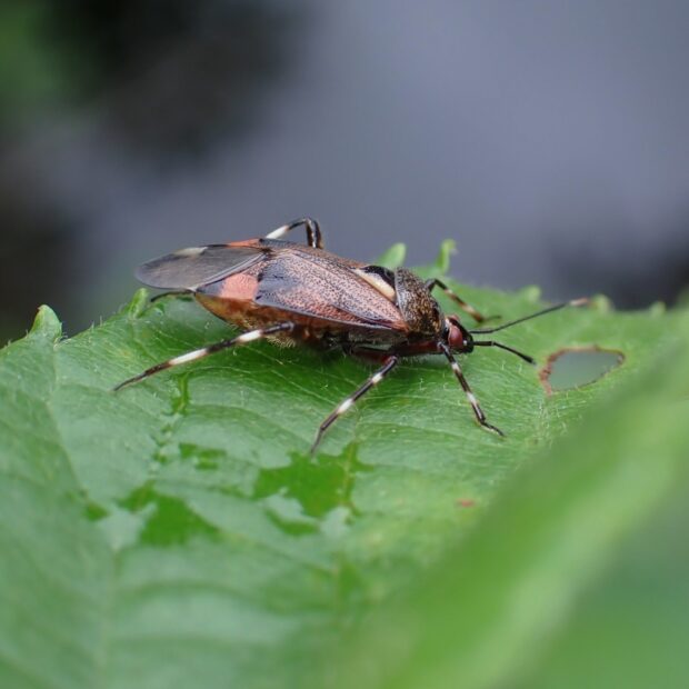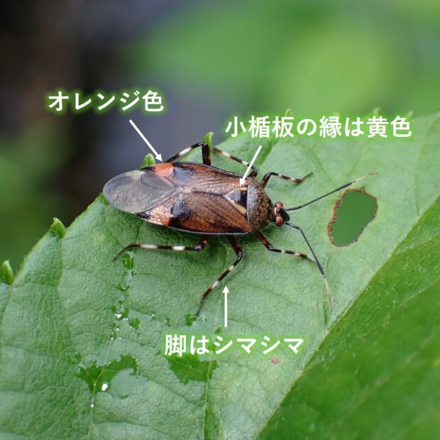 カスミカメムシ科の仲間。 オレンジ色の紋をもつ最大級のカスミカメムシ。 ヤナギやハンノキなどの樹上でハムシの幼虫を食べます。