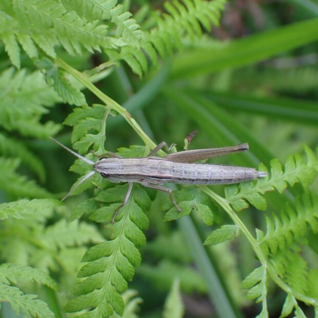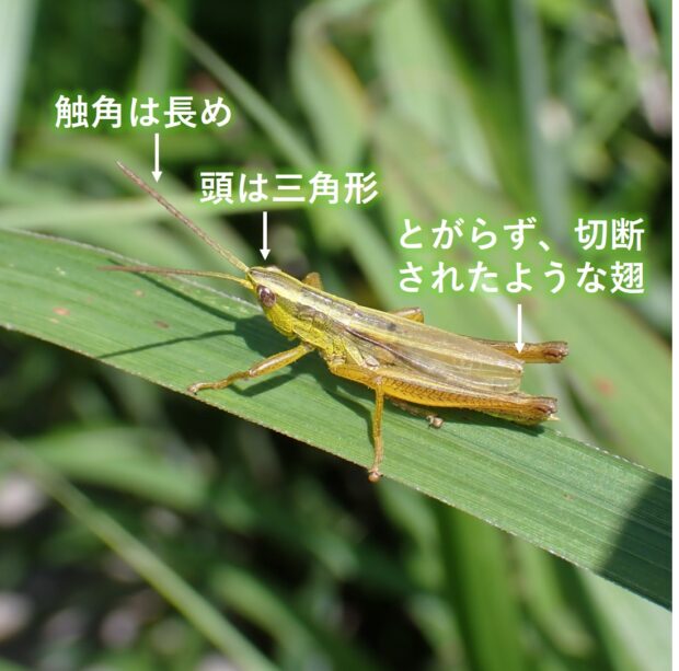 ススキなどの背の高い草地で見られるバッタの仲間。 オスはシャカシャカシャカ・・・と、 後あしを前ばねにこすりつけて、 盛んに鳴きます(音を出します)。 オスもメスも飛ぶことができません。