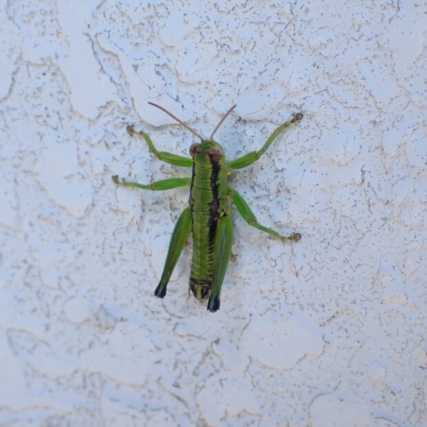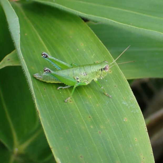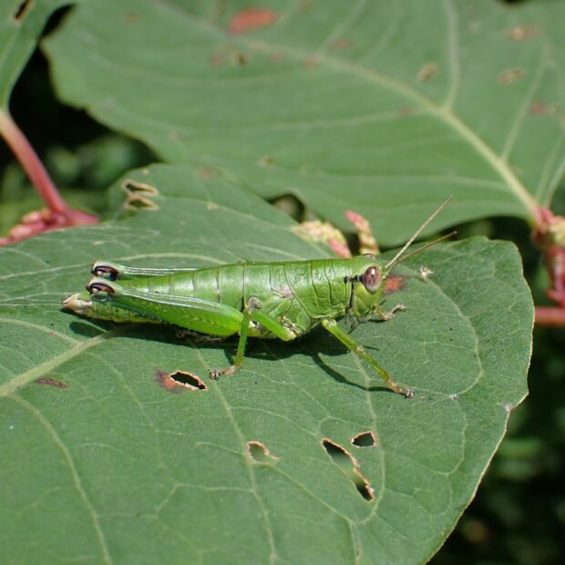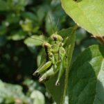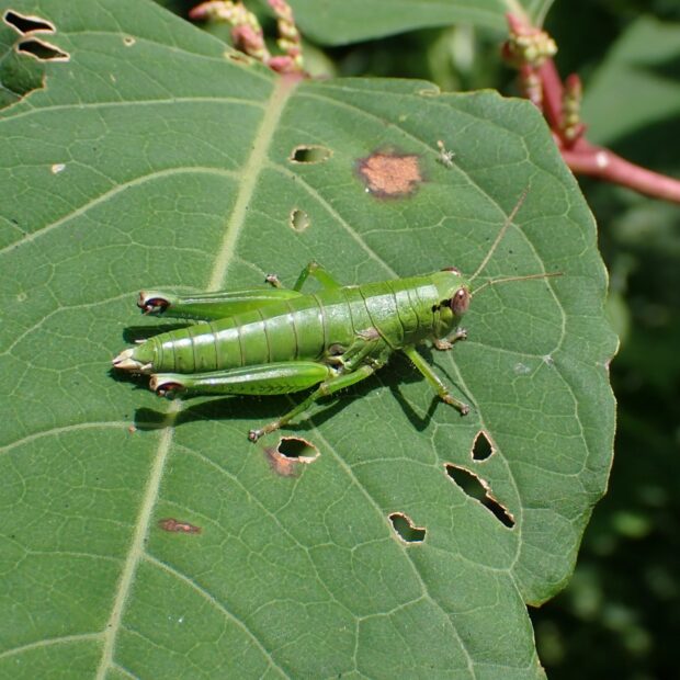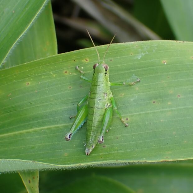 林縁や草地で見られる北方系のフキバッタ。 体は緑色。 オスは頭部から腹部先端まで黒い線がありますが、 メスは眼の後ろに少しあるだけです。 はねは退化し飛ぶことができません。