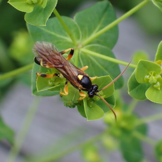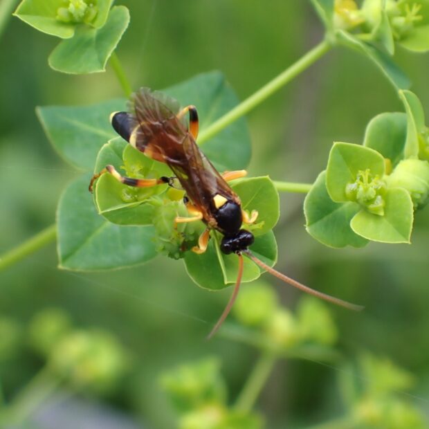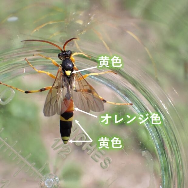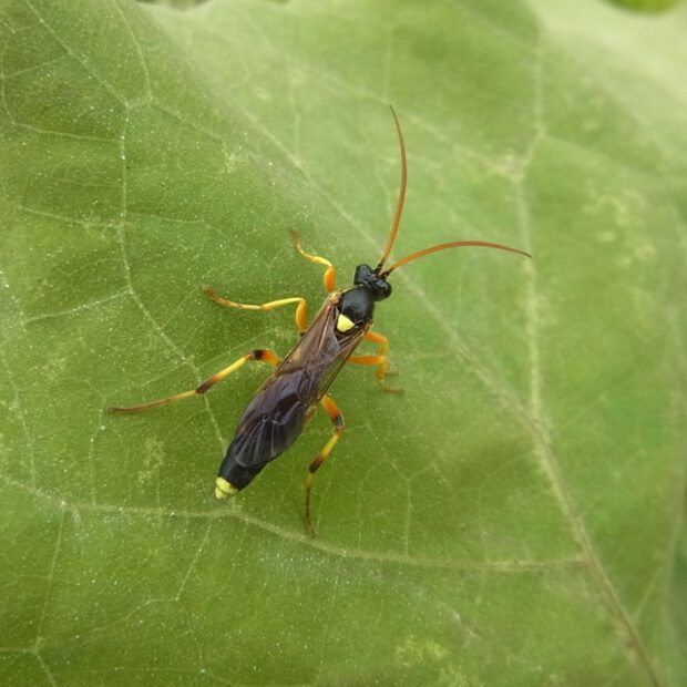 ヒメバチ科の仲間。 アゲハの幼虫に卵を産む寄生バチ。 体やあしはカラフルな色合いで美しいハチ。 草地の花にやって来ます。