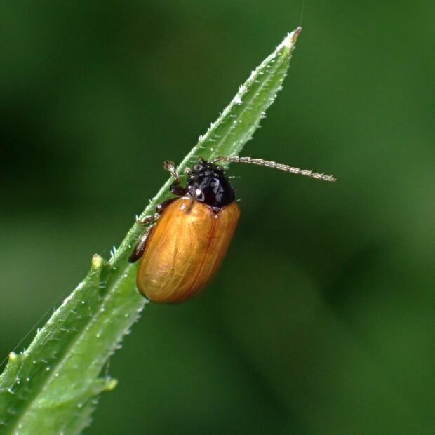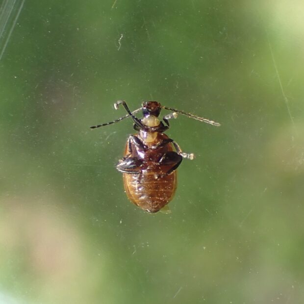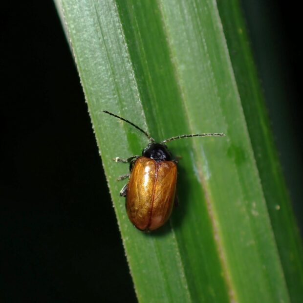 ハムシ科ノミハムシの仲間。 上翅は黄褐色でツヤがあり、 頭部、 胸部、 触角、 あしは黒色です。 後あし腿節(たいせつ)が太く、 危険を感じると跳んで逃げます。