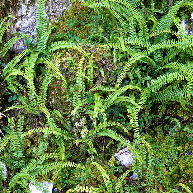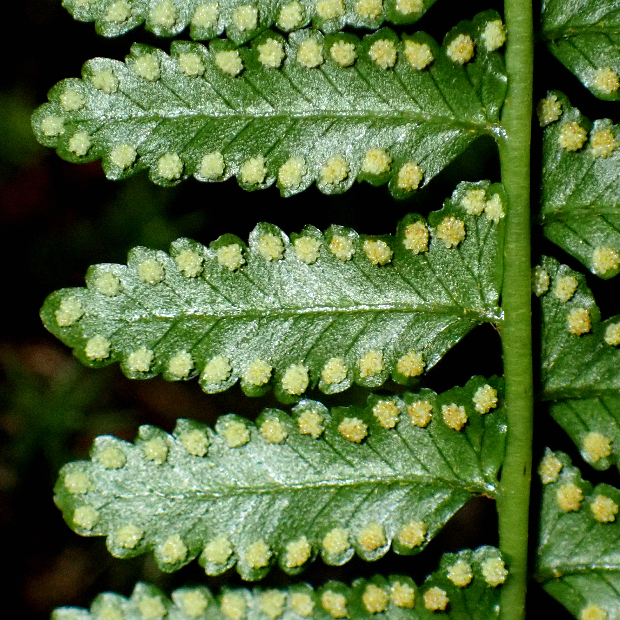 暖かい地域の山地に生える細長めのシダ。 大きな特徴は、 葉先が細く伸びて先に無性芽をつけることで、 クローン集団が群生していることがよくあります。 葉は濃緑色でツヤがあり、 葉裏につく胞子のう群は円形で包膜がなく、 葉柄基部には毛をつけます。
