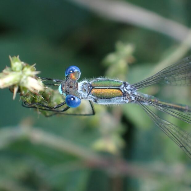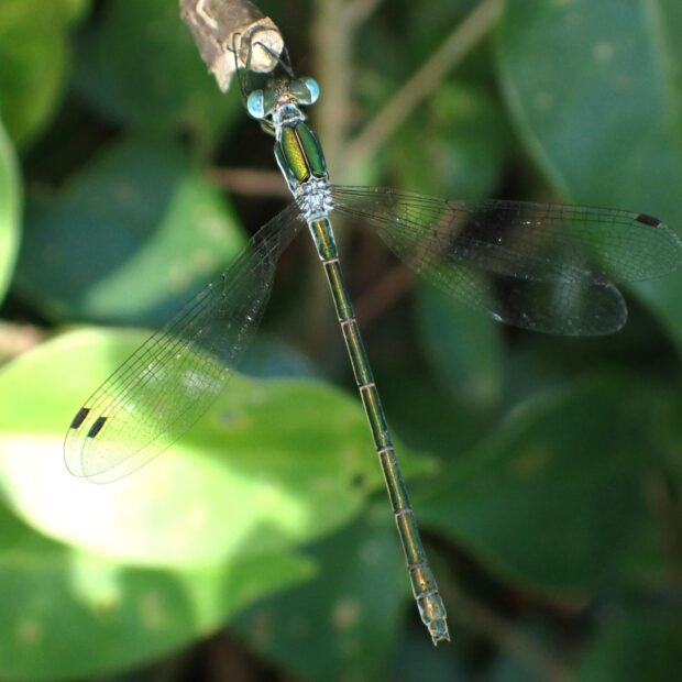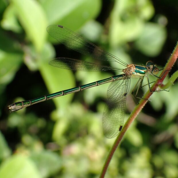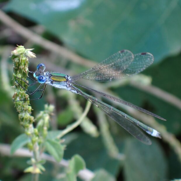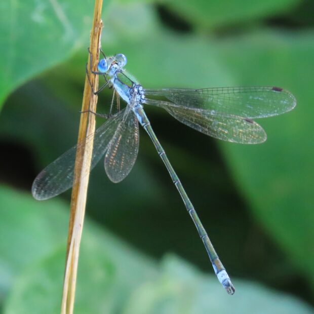 オオアオイトトンボは成熟しても白い粉をおびませんが、 本種のオスと一部のメスは白い粉をおびます。