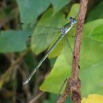 アオイトトンボ科の仲間。 水生植物が生えている池や湿地で見られます。 オスは成熟すると胸と腹端に白い粉をおびます。 メスは、 白い粉をおびるものとおびないものがいます。 未熟な成虫は林縁で過ごし、 9月頃になると池に戻ります。 メスはイネ科などの植物に産卵します。 卵越冬。