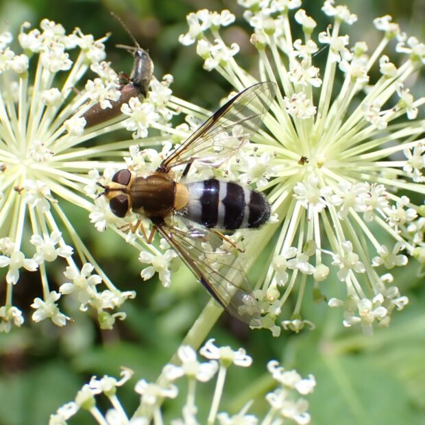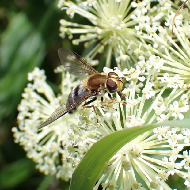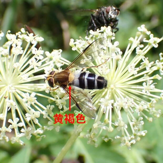 山の花に集まるヒラタアブの仲間。 ヨコモンヒラタアブに似ていますが、 ヨコモンヒラタアブの小楯板(しょうじゅんばん)は黒色、 本種は黄褐色です。