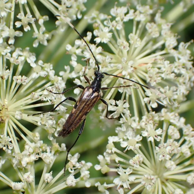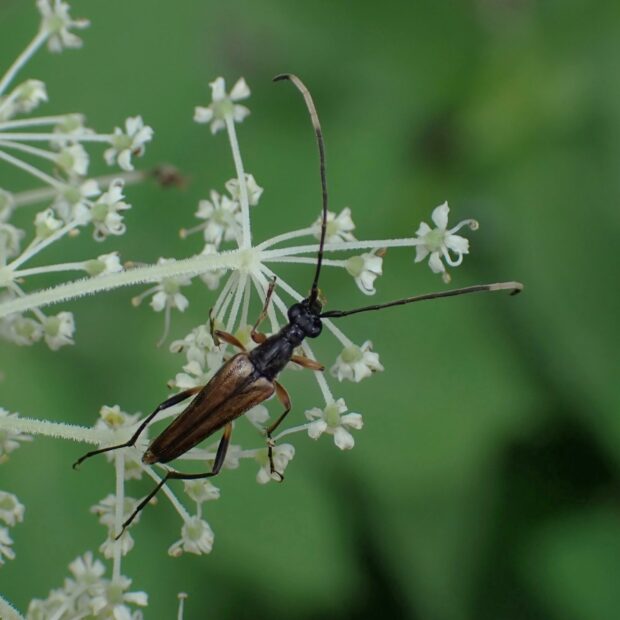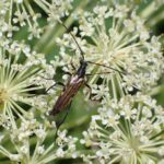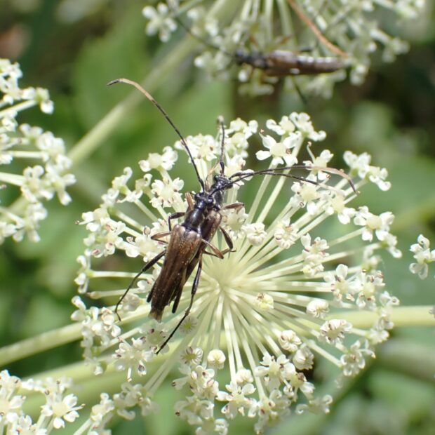 花に集まるハナカミキリの仲間。 丘陵地~山で普通に見られます。 体は細長く、 黒い触角の先端付近の黄白色が特徴的。 ニンフはギリシャ神話に出てくる妖精の意味。 タテジマホソハナカミキリに似ていますが、 本種の方が体が長く、 触角の黄白色の部分に違いが見られます。