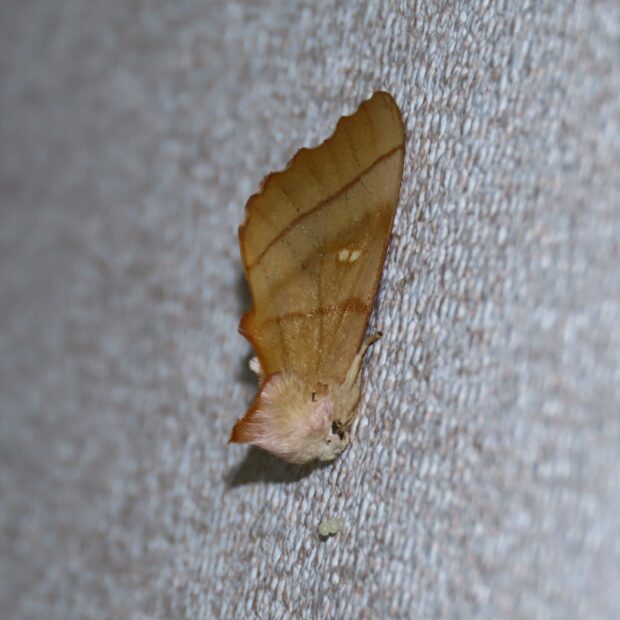 シャチホコガの仲間。 平地~山。 褐色の前ばねには横線と小さな黄色い紋があります。 胸部の背面に毛束が高く突き出ているのが特徴的。 これが名前の由来になっています。
