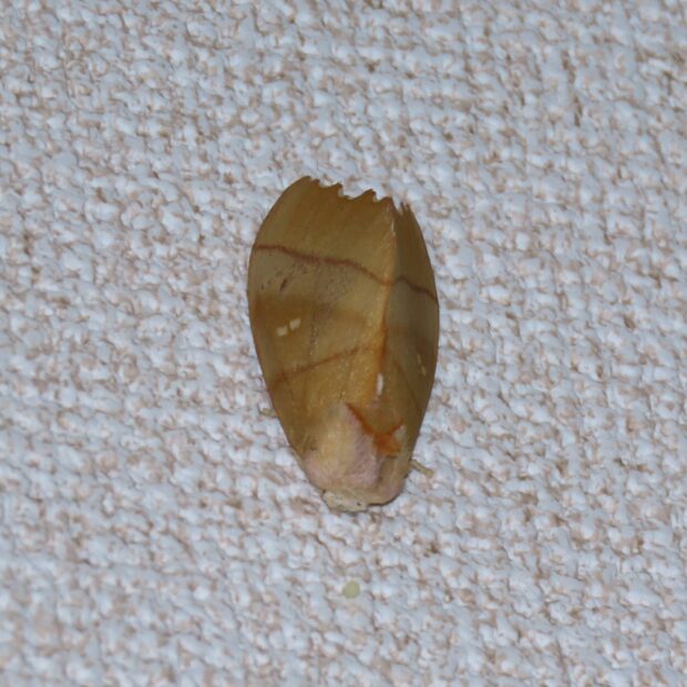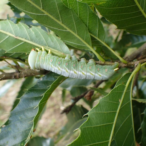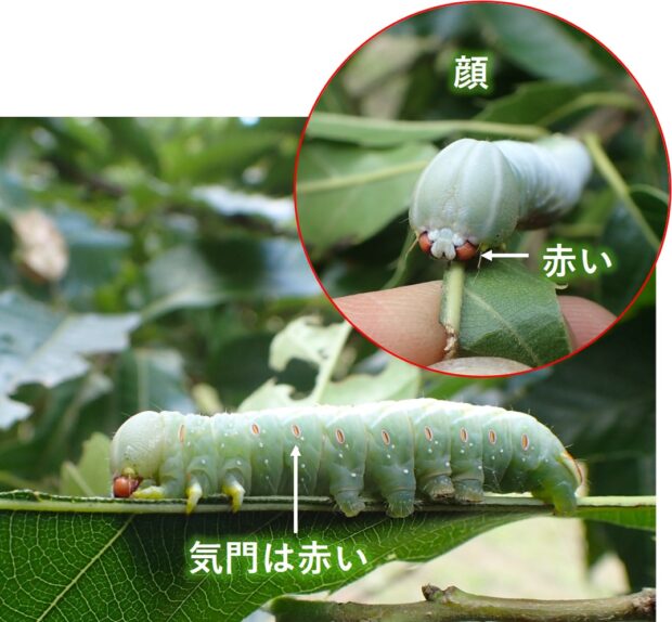 • 終齢幼虫。 体の側面に白い斜めの線が並ぶ。