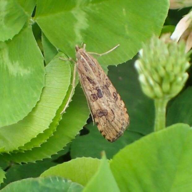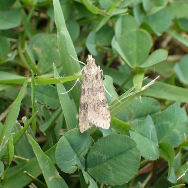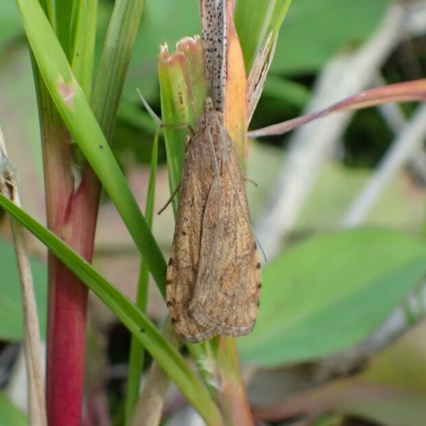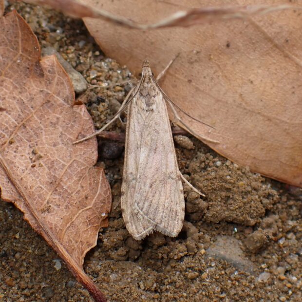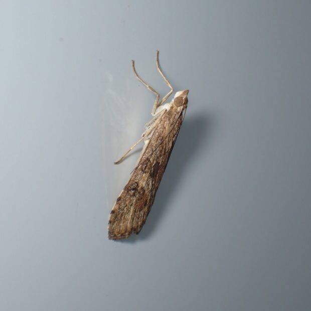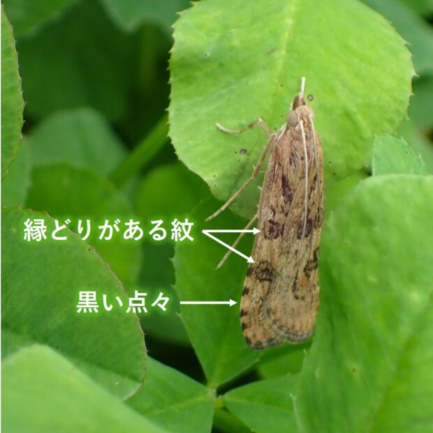 ツトガ科ノメイガの仲間。 茶色の細長い前ばねには、 黒い縁取りのある紋が3個あり、 縁に黒点が並んでいます。 草地などで普通に見られます。