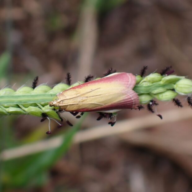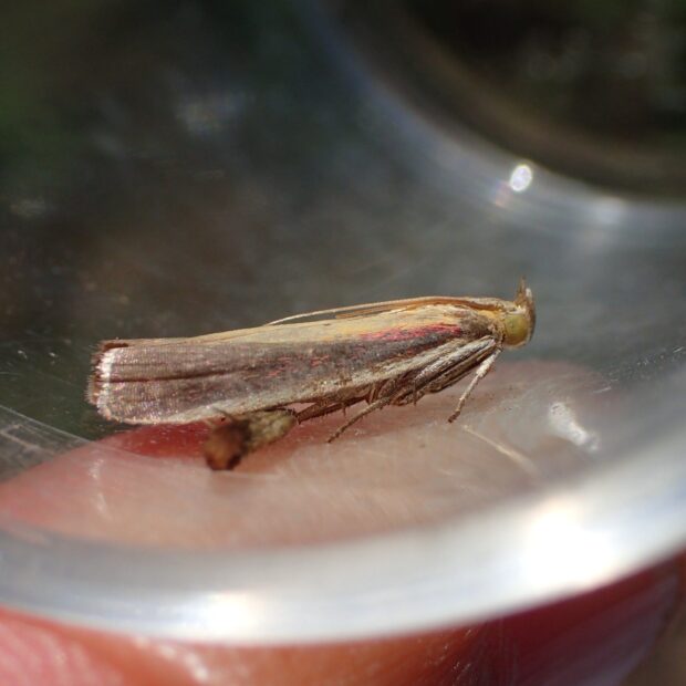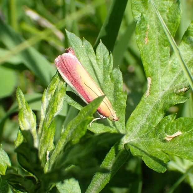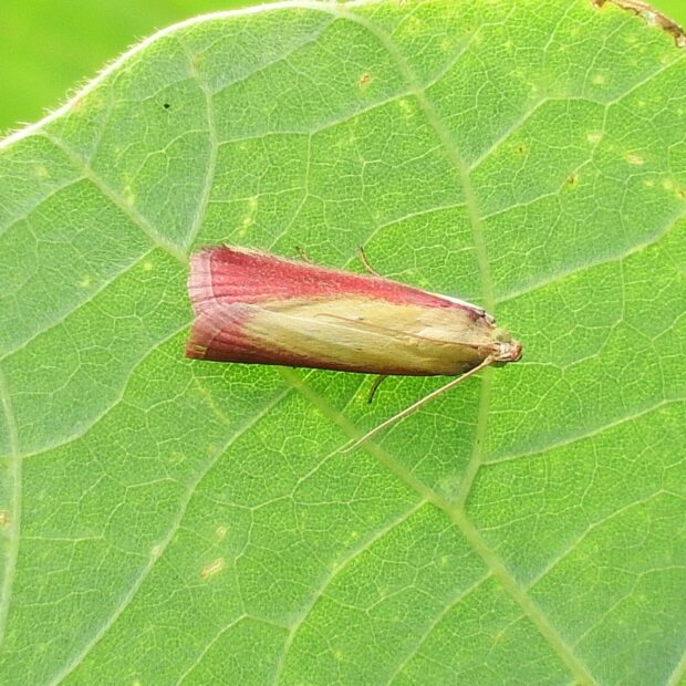 メイガ科マダラメイガの仲間。 前ばねは黄色で、 周りは赤色~灰色。 色はいろいろで、 変化が見られます。 草地などで普通に見られます。