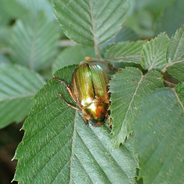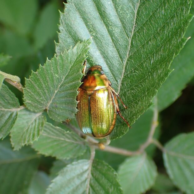 サクラ類などで見られるコガネムシ。 体はツヤがあり、 上翅(じょうし)は緑銅色~黄褐色で、 変化に富みます。 ツヤコガネに似ています。