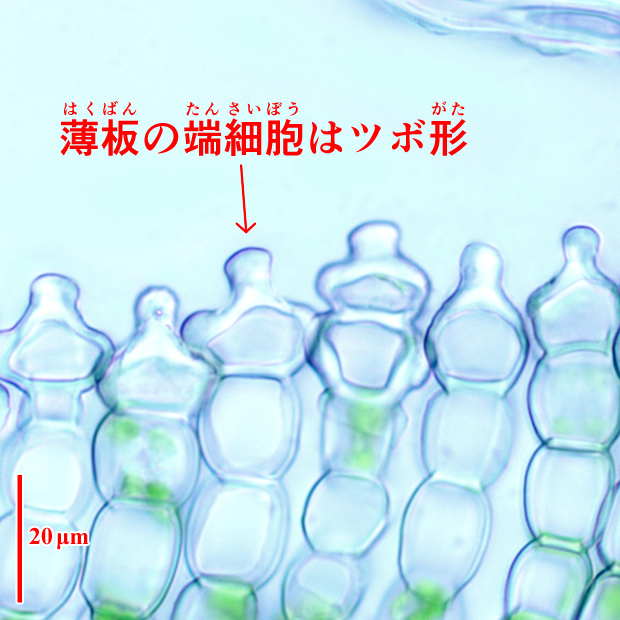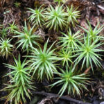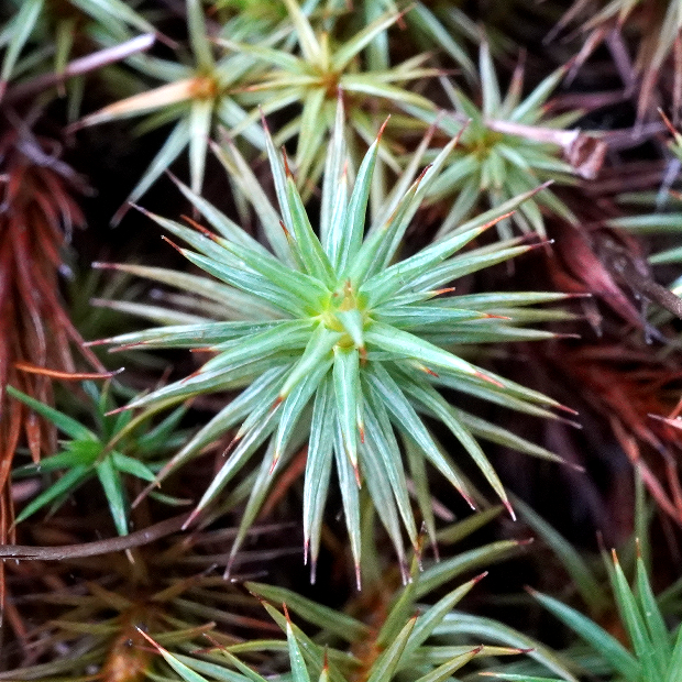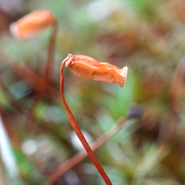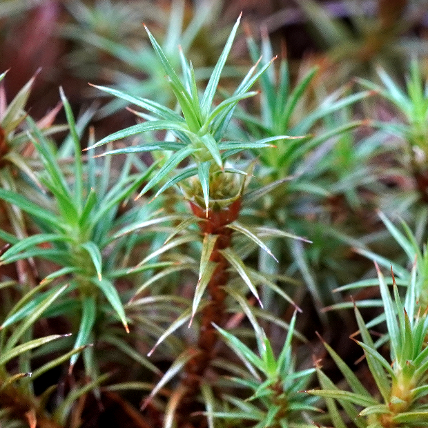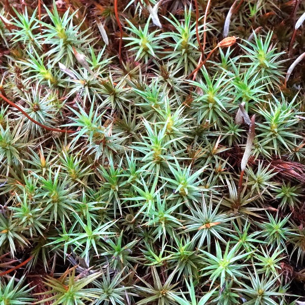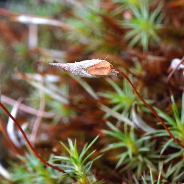 スギの芽生えのようなコケ植物。 涼しい山地の土上でマット状に生えます。 スギゴケ科には多くの種類がありますが、 葉のフチが内側に巻き、 ギザギザ(鋸歯)がないこと、 葉先が赤っぽいことなどが大きな特徴です。 蒴の帽には白毛が多くつきます。