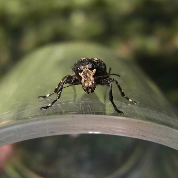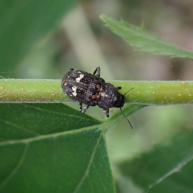 ヒゲナガゾウムシ科の仲間。 名前のとおり顔が白いゾウムシ。 正面から見ると口吻が平らで短く、 ゾウムシらしくありません。 枯れ木などに集まります。
