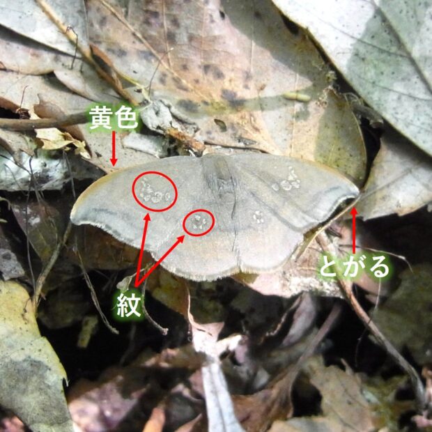 • 前ばねの先端がとがる。 前ばねと後ばねの真ん中に紋が散らばる。