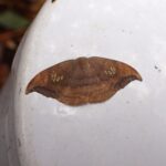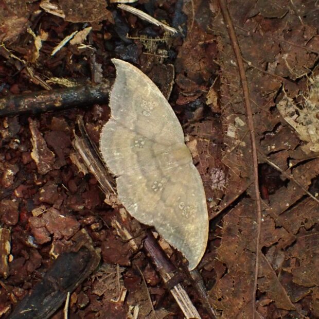 カギバガ科の仲間。 前ばねと後ばねの真ん中に数個の紋があるのが特徴的。 はねは茶色ですが、 色は濃淡がありいろいろです。 明かりにやって来ます。