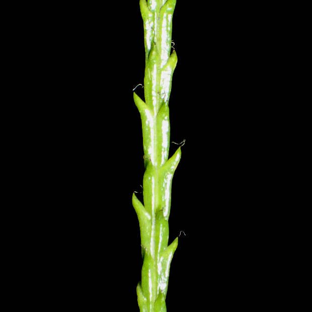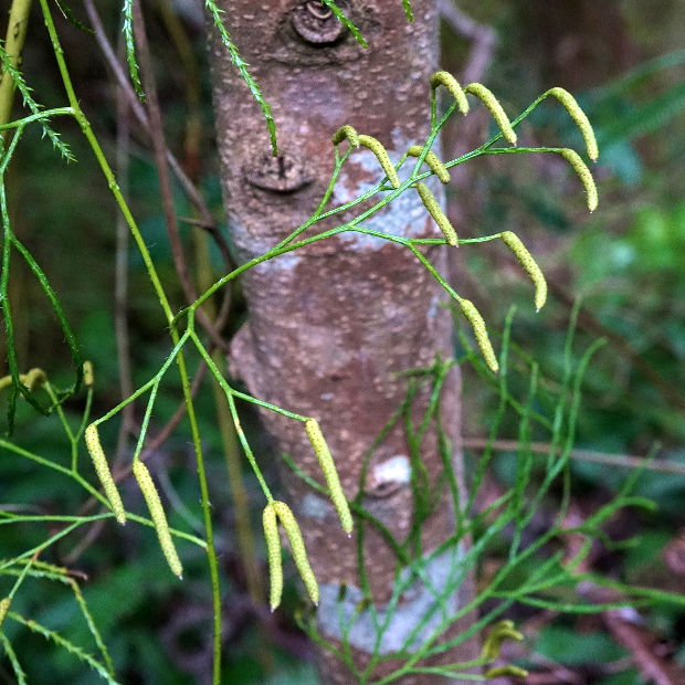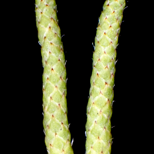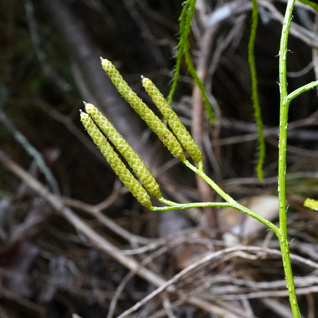主茎から柄が出て、 黄色っぽい胞子のう穂を垂らす。